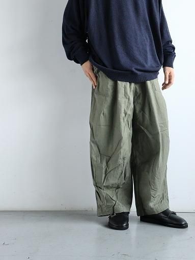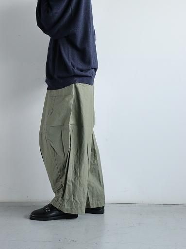立体的に形成された独特なフォルムが とても素敵なH.D(ヒザデル)パンツ ミリタリーのファティーグパンツを 改良したようなデザインです この度より一新したファブリックは コシハリと程よい柔らかさを併せ持つ コットン100%のバックサテン シルエットが綺麗に映るうえ シーズン通してお穿きいただけます 穿き心地はイージーですが フロントはきちんと創りこまれており ウエストはドローコードやサイドのアジャストにて 調節できる仕様だったり バックスタイルはフラップポケットが施されています ダーツ等で形成された ヒザデルな立体的シルエットに ミリタリーな素材感とディティールが落とし込まれた 落ち感綺麗で穿くだけで雰囲気良く纏まるパンツ 大人なワイドパンツのような タイパンツやサルエルパンツのニュアンスも感じる ヒザデルパンツ Tシャツやブラウス等の軽装な出で立ちにも ボリュームあるアウターにも バランスよく纏まるようです SIZE SPEC (cm) SIZE 1 ウエスト78.0 わたり幅42.0 裾幅28.0 股上39.0 股下60.0 SIZE S ウエスト79.0 わたり幅42.5 裾幅28.5 股上39.0 股下61.5 SIZE M ウエスト83.0 わたり幅43.0 裾幅29.0 股上40.0 股下63.5 SIZE L ウエスト88.0 わたり幅44.0 裾幅29.5 股上41.0 股下64.5 ※1 サイズ計測の多少の誤差はご了承下さいませ ※2 ウエストはドローコードを絞ってない状態の寸法となります ※3 165cm 50kgの男性(着用画像)で size 1 または size S を着用 (※着用画像は size 1 ) ※4 171cm 60kgの男性で size size S を着用 ※5 174cm 68kgの男性で size S または size M を着用 ※6 180cm 70kgの男性で size M または size L を着用しております ※7 160cm の女性(着用画像)で size 1 を着用 Cotton 100% made in Japan ![]() ![]() ![]() ![]() ![]() ![]() ![]() ![]() 実物の色合いと異なる場合がございますので 何卒ご了承下さいませ 無断での複写・転載はご遠慮くださいませ ![]() ※ サイズ計測の多少の誤差はご了承下さいませ ![]() ![]()