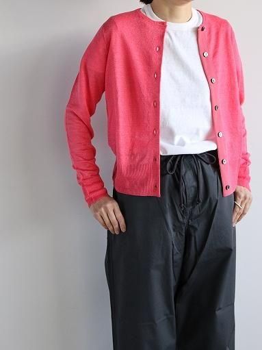 風合いがダイレクトに伝わる 綺麗な色合いの ボタンカーディガン 「eleven 2nd」 より届きました 「eleven 2nd」は デザイナーの橋本靖代さんの手編みによる 暮らしを意識した様々なニットプロダクトと カシミヤをはじめとする 上質なニットウェアやストールを提案しています 素材は上質なリネンで 微光沢のある上品な佇まいと 滑らかな肌当たりが格別な 清涼感のある質感です シンプルなデザインですが 前立て下はテープが施されているので 開け羽織った時などに 配色感がある雰囲気良い容姿です とても上質な素材感を ミニマムな容姿にまとめながら ほのかなアクセントを加えた感じが とても素敵な一枚です リネンの涼しげなシャリ感や 楽しくなるカラートーンなど 春そして夏にとても適したアイテムです e2W-1089 SIZE SPEC (cm) SIZE M 身幅43.0 肩幅31.0 着丈53.5 袖丈57.0 ※1 サイズ計測の多少の誤差はご了承下さいませ ※2 160cmの女性(着用画像)で size M を着用しています Linen 100% made in Japan ![]() ![]() ![]() ![]() ![]() ![]() ![]() ![]() ![]() col.White ![]() col.Beige ![]() col.Cherry ![]() col.Leaf Green ![]() ![]() 実物の色合いと異なる場合がございますので 何卒ご了承下さいませ 無断での複写・転載はご遠慮くださいませ ![]() ※ サイズ計測の多少の誤差はご了承下さいませ ![]() ![]()