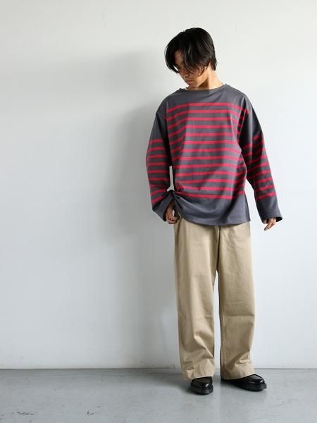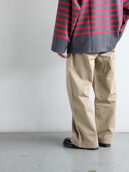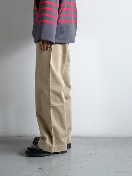 パターンや仕様など 細部にわたり 仕立ての良さと独自の趣向が バランス良く詰まったチノパンツ ファブリックは 洗いによる凹凸が雰囲気良い 上質なコットンチノクロスを用いて 全体的にゆとりをもたせて 裾にかけてストンと落ちるような ワイドストレートなシルエットなど 一見 古き良き軍チノ的な要素も感じますが クラシカルなトラウザーの雰囲気もあり 大人なバランスに纏まっています パッカリングが際立つ巻縫いのアウトシームや 手もみにより細く仕上げられた もみ玉縁仕様のバックポケットなど 仕立てのレベルの高さや 小気味の効いたディティールによる サンリミットらしい出で立ちと完成度による ならではなチノパンツです W2503033 SIZE SPEC (cm) SIZE -1 ウエスト73.0 わたり幅33.0 裾幅26.5 股上36.5 股下68.0 総丈101.5 SIZE 0 ウエスト77.0 わたり幅34.0 裾幅27.0 股上37.0 股下71.0 総丈104.0 SIZE 1 ウエスト82.0 わたり幅36.0 裾幅27.5 股上37.5 股下73.5 総丈107.5 SIZE 2 ウエスト87.0 わたり幅38.0 裾幅28.0 股上38.0 股下76.0 総丈110.0 ※1 サイズ計測の多少の誤差はご了承下さいませ ※2 165cm 50kgの男性(着用画像)で size -1 または size 0 を着用 (※着用画像は size -1 を着用しています) ※3 171cm 60kgの男性(着用画像)で size -1 または size 0 を着用 (※着用画像は size 0 を着用しています) ※4 174cm 68kgの男性で size 0 または size 1 を着用 ※5 180cm 70kgの男性で size 1 または size 2 を着用 ※6 165cm 50kgの男性の着用画像は裾を3cmほど折り込んでいます Cotton 100% made in Japan ![]() ![]() ![]() ![]() ![]() ※171cm 60kg の男性が size 0 を着用しています ![]() ※171cm 60kg の男性が size 0 を着用しています ![]() ※171cm 60kg の男性が size 0 を着用しています ![]() ※165cm 50kg の男性が size -1 を着用しています ![]() ※165cm 50kg の男性が size -1 を着用しています ![]() ![]() ![]() 実物の色合いと異なる場合がございますので 何卒ご了承下さいませ 無断での複写・転載はご遠慮くださいませ ![]() ※ サイズ計測の多少の誤差はご了承下さいませ ![]() ![]()