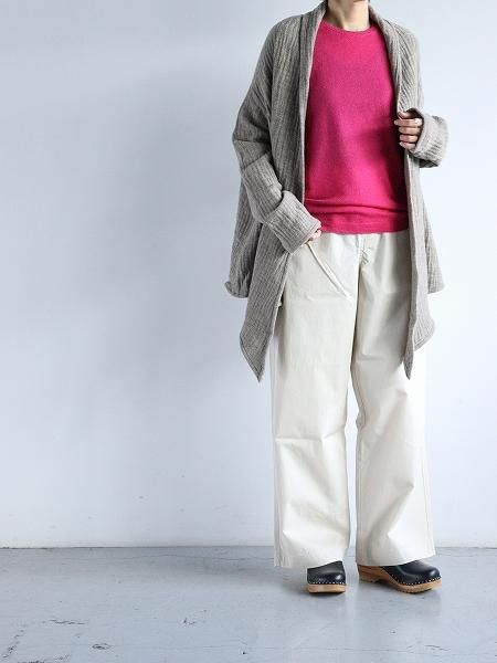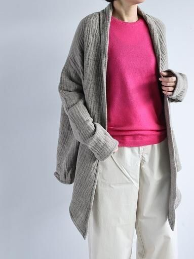 「eleven 2nd」 デザイナーの橋本靖代さんの手編みによる 暮らしを意識した様々なニットプロダクトと 2019年AWより上質なニットウェアやストールを 中心に展開しているブランドです そして今回ご紹介するのは eleven 2nd 橋本さんが長年にわたり 最も得意とするアイテムが カシミヤのニット とても軽さがありながら暖かく そしてとても心地の良い肌触りは格別で その素材感は至高のクオリティです ふんわりと空気を含んだような その質感は秋冬シーズンにかかせません 素材感が際立つような シンプルなデザインと佇まい 丁寧に大切に作られた とても素敵なニットウェアです 歳を重ねるにつれて より一層 ファインゲージのカシミヤニットはかかせません --------------- ちなみにイレブンセカンドのカシミヤアイテム名に 記載されている「no.2」はファインゲージのことを指します (カシミヤ細糸によるハイゲージ) ※「no.1」はエクストラファインゲージ (カシミヤ極細糸によるハイゲージ) e2W-1094 SIZE SPEC (cm) SIZE M(ONE) 身幅45.0 着丈62.0 裄丈76.0 ※1 サイズ計測の多少の誤差はご了承下さいませ ※2 160cmの女性(着用画像)で size M を着用しています Cashmere 100% made in Japan ![]() ![]() ![]() ![]() ![]() ![]() ![]() ![]() ![]() ![]() ![]() col.Rose ![]() col.Magenta ![]() 実物の色合いと異なる場合がございますので 何卒ご了承下さいませ 無断での複写・転載はご遠慮くださいませ ![]() ※ サイズ計測の多少の誤差はご了承下さいませ ![]() ![]()
