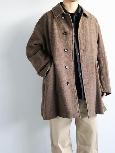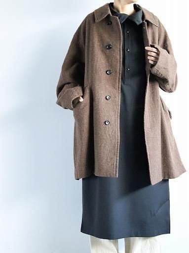 日本最大の毛織物産地である尾州地区にて 50年以上続いていた織工場のアイデンティティーを引き継ぎ 「織り」に重きを置いて ブランケットやラグからストールまで 独自のファブリックを提案するテキスタイルブランド・・・ loomer ルーマー 50年以上前のションヘル織機や低速のレピア織機を活用し 特色ある原料の選定・糸作り・生地設計・織りから テキスタイルを作り上げ織屋ならではの モノ創りを展開されています そして今回ご紹介するのは Uruguay Wool Coat 弾力性やバルキー性に優れた ウルグアイウールの天然色原料を使用して あえて昔のウールのような表情を出すために 粗目な原料を選んで紡績しています また縫製後に 特殊な洗い加工を施して クラシカルな雰囲気に仕上げています シルエットは 脇下から裾にかけてAラインに広がった たっぷりとしたフォルムで 一般的なコートよりも着丈の設定を短くして バランスを整えていたり 首元や袖幅や 斜めに施された 大き目のフラップポケット等も ゆったりとしたフォルムに合わせるように 施されています 奥行きあるブラウンの発色が 立体的で絶妙な表情に仕上がった バルマカンコート こういうシルエットで 洗いざらしたようなウールの質感というところが 新鮮で絶妙な落としどころかと アンダーに厚手のニットや ジャケット等を着ていても 上からガバッと羽織りやすく オーバーコートとしても重宝し スタイリッシュに纏めてくれる様です No.LM325-CT043 SIZE SPEC (cm) SIZE 1 身幅69.0 肩幅56.0 着丈92.0 袖丈59.0 SIZE 2 身幅72.0 肩幅59.0 着丈101.0 袖丈62.0 ※1 サイズ計測の多少の誤差はご了承下さいませ ※2 165cm 52kgの男性で size 1 を着用 ※3 170cm 60kgの男性(着用画像)で size 1 を着用 ※4 174cm 68kgの男性で size 1 または size 2 を着用 ※5 180cm 70kgの男性で size 2 を着用しております ※6 160cm の女性(着用画像)で size 1 を着用しています BODY : Wool 100% LINING : Cotton 100% made in Japan ![]() ![]() ![]() ![]() ![]() ![]() ![]() ![]() ![]() ![]() ![]() ![]() ![]() ![]() ![]() 実物の色合いと異なる場合がございますので 何卒ご了承下さいませ 無断での複写・転載はご遠慮くださいませ ![]() ※ サイズ計測の多少の誤差はご了承下さいませ ![]() ![]()
