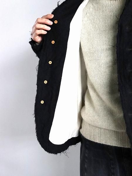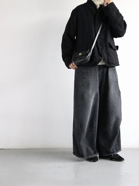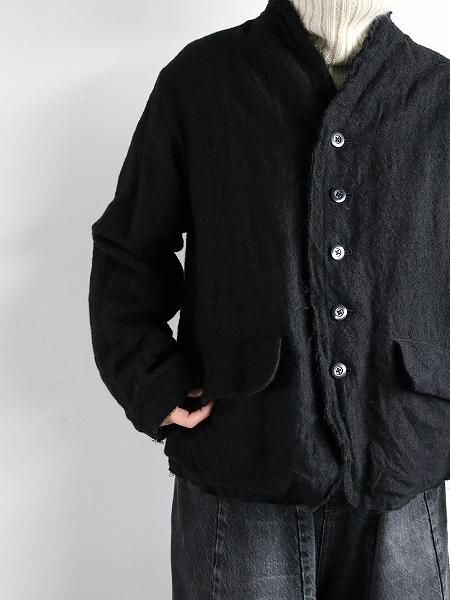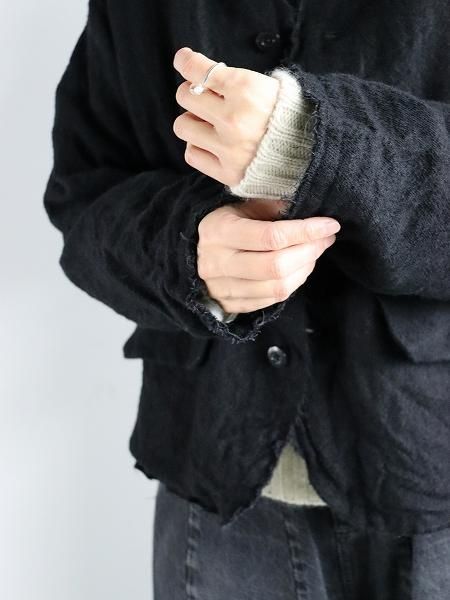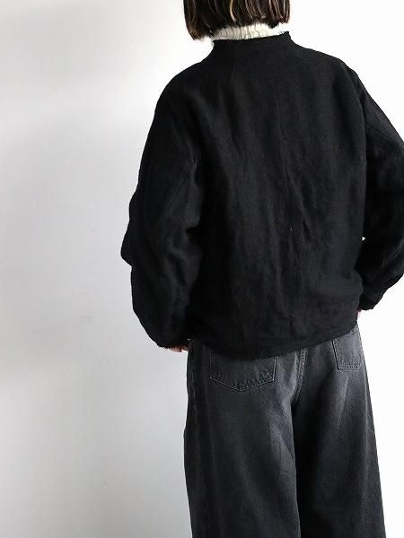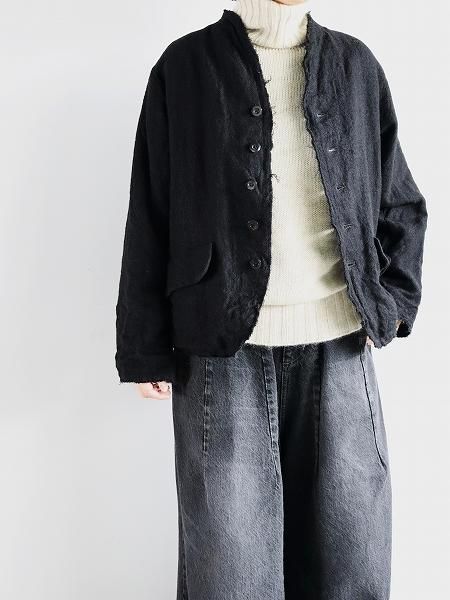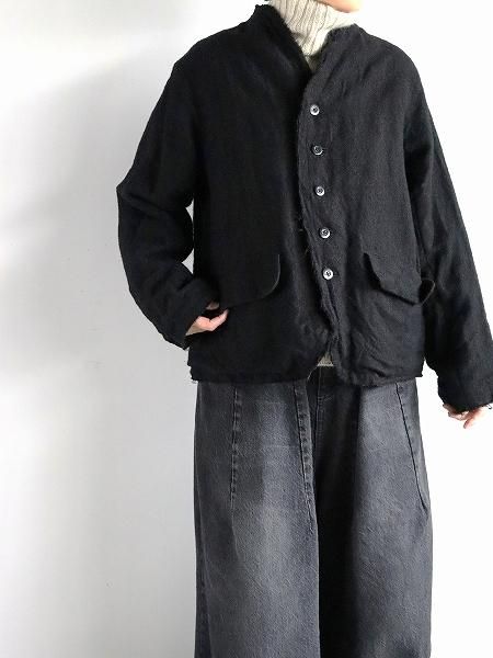 CLOLI : クロリ LINEN CLOTHと仏語のCOLORISを掛け合わせた 「日常に彩りを」を意味する造語 ワークウェアをベースにしながら 上質な普段着の着心地を体現するため デザイナー自ら全ての工程を担い 緻密なパターンの線を引き トワルを作成し サイズやシルエットを確認して 丁寧に製作されています そんな銘柄から今回ご紹介するのは LINEN WOOL STAND COLLAR JACKET 素材はタテ糸にウールと ヨコ糸にリネンを使用した交織織物で 仕上げに縮絨して毛羽立たせ 剪毛して圧絨することで 生地表面に短い毛羽を持たせる ハードミルド加工を施しています また端はカットオフで仕上げていたり 裏地に綿生地を使用して 洗いをかけて表と裏の収縮差を出していたりと ラフな表情が絶妙な仕上がりです フロントは湾曲したスタンドカラーだったり 後ろにはダーツが施されていたりと ワークな雰囲気もありながら スッキリとした容姿に纏められています 柔らかい素材や 少しゆるさを持たせたシルエット等により オーセンティックなジャケットとは異なり 気負わず羽織れそうです これからの季節にはアウターとしても 寒い時はコート下にと 手放せなくなりそうです CL-JK061 SIZE SPEC (cm) SIZE 1 身幅53.0 肩幅42.0 着丈65.0 袖丈57.0 ※1 サイズ計測の多少の誤差はご了承下さいませ ※2 160cmの女性(着用画像)で size 1 を着用しています Wool 55% Linen 45% made in Japan ![]() ![]() ![]() ![]() ![]() ![]() ![]() ![]() ![]() ![]() ![]() 実物の色合いと異なる場合がございますので 何卒ご了承下さいませ 無断での複写・転載はご遠慮くださいませ ![]() ※ サイズ計測の多少の誤差はご了承下さいませ ![]() ![]()