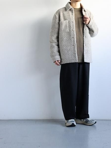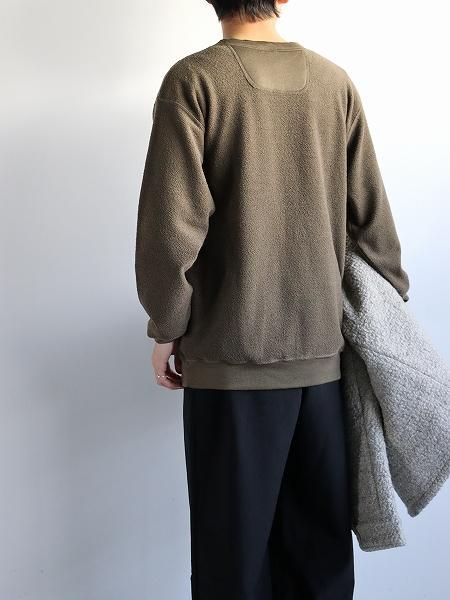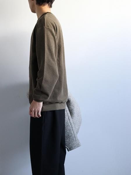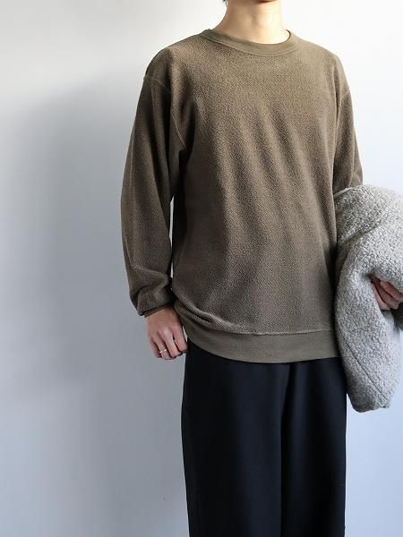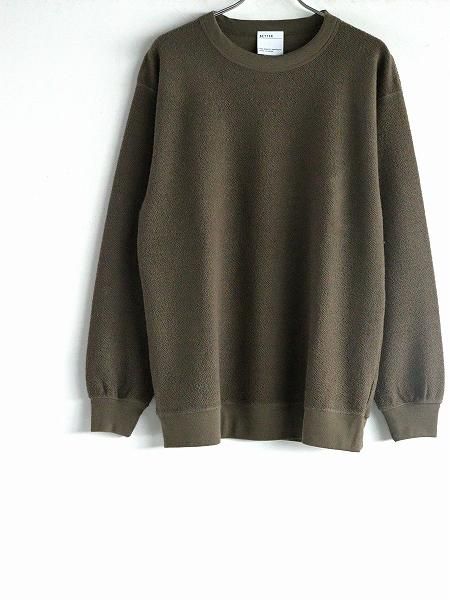 上質な素材のスウェットが BETTERより届きました ファブリックはカシミアと同クラスの 超極細メリノウール糸で編み立てた ハイクオリティーな裏毛素材 高品質ウール特有の光沢があり カシミアのようなとろみのある 絶妙な素材感です そんな素材のスウェットを裏使いして ウォーム感のある容姿に仕上げています フロントはクルーネックで 背中にはミリタリーな仕様が施されているので 1枚で着ても雰囲気良い仕上がりです またシルエットは スッキリと纏められているので どんなアウターにもストレスなく着ていただけます 上質なニットのように 柔らかなドレープが綺麗なスウェットなので 大人な印象に纏まるようです BTR2533 SIZE SPEC (cm) SIZE 2 身幅 55.0 肩幅 51.0 着丈 72.0 袖丈 59.0 SIZE 3 身幅 57.0 肩幅 53.0 着丈 74.0 袖丈 61.0 ※1 サイズ計測の多少の誤差はご了承下さいませ ※2 165cm 52kgの男性で size 2 を着用 ※3 170cm 60kgの男性(着用画像)で size 2 (※着用画像は col.OLIVE col.NAVY どちらも size 2 を着用 ) ※4 174cm 68kgの男性で size 2 または size 3 を着用 ※5 180cm 70kgの男性で size 3 を着用 Wool 100% made in Japan ![]() ![]() ![]() ![]() ![]() ![]() ![]() ![]() ![]() ![]() ![]() ![]() ![]() col.OLIVE ![]() col.NAVY ![]() col.BLACK ![]() ![]() 実物の色合いと異なる場合がございますので 何卒ご了承下さいませ 無断での複写・転載はご遠慮くださいませ ![]() ※ サイズ計測の多少の誤差はご了承下さいませ ![]() ![]()